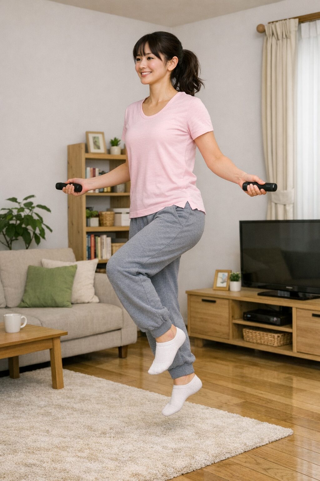 エア縄跳びは、室内でも行えるため、天候に左右されずに続けやすいのが特長です。